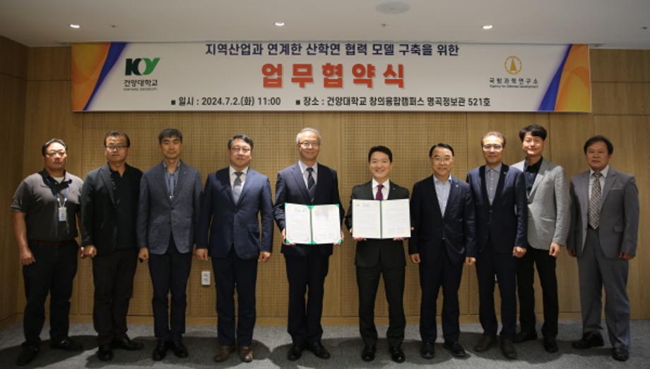 건양대-국방과학연구소, 국방전력강화 위한 업무협약 체결 건양대학교(총장 김용하)와 국방과학연구소(소장 이건완)가 2일 오전 건양대 논산 창의융합캠퍼스 명곡정보관에서 지역산업과 연계한 산학연 협력 모델 구축을 위한 업무협약을 체결했다. 이날 협약식에는 건양대 최임수 부총장, 최명진 입학처장, 김화중 총무처장, 홍영기 산학협력단장, 심행근 산학전문교수와 국방과학연구소 조규공 군전력연구센터장, 이용식 대외협력실장, 박진현 소요기획연구팀장, 전우근·배영민 소요기획팀 책임연구원 등이 참석했다. 양 기관은 이날 협약을 통해 국방력 강화를 위한 과학기술 발전, 지역사회 및 산업발전, 산학연 협력모델 구축, 지역사회 인재 발굴과 육성 등을 적극적 지원하고 협력하기로 했다. 특히 ▲국방전력 강화에 필요한 과학기술 분야 ▲군 전력 강화를 위한 사전개념연구 분야 ▲군 전력소요 업무발전을 위한 지식정보 교류 분야 등에 대한 학·연 교류를 강화하기로 했다.